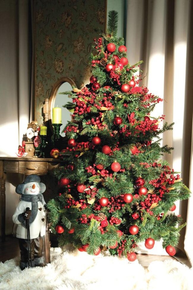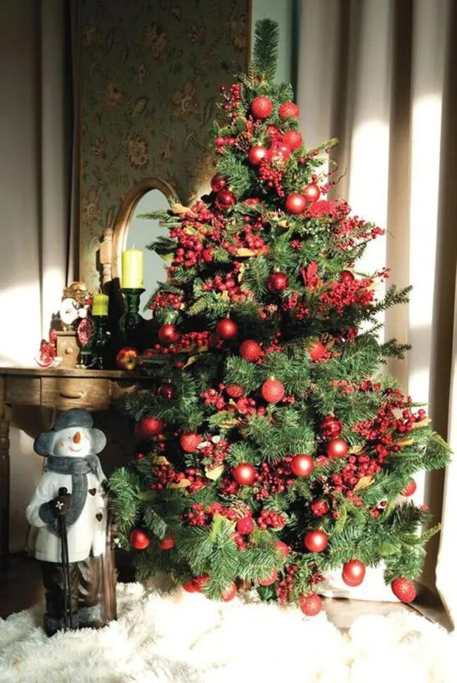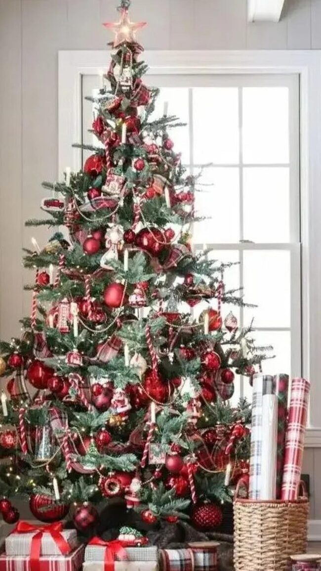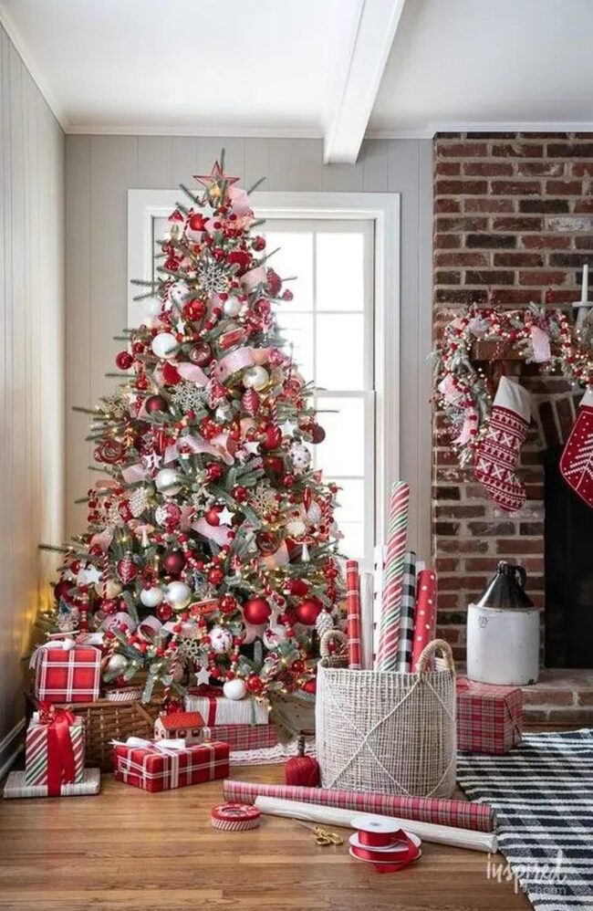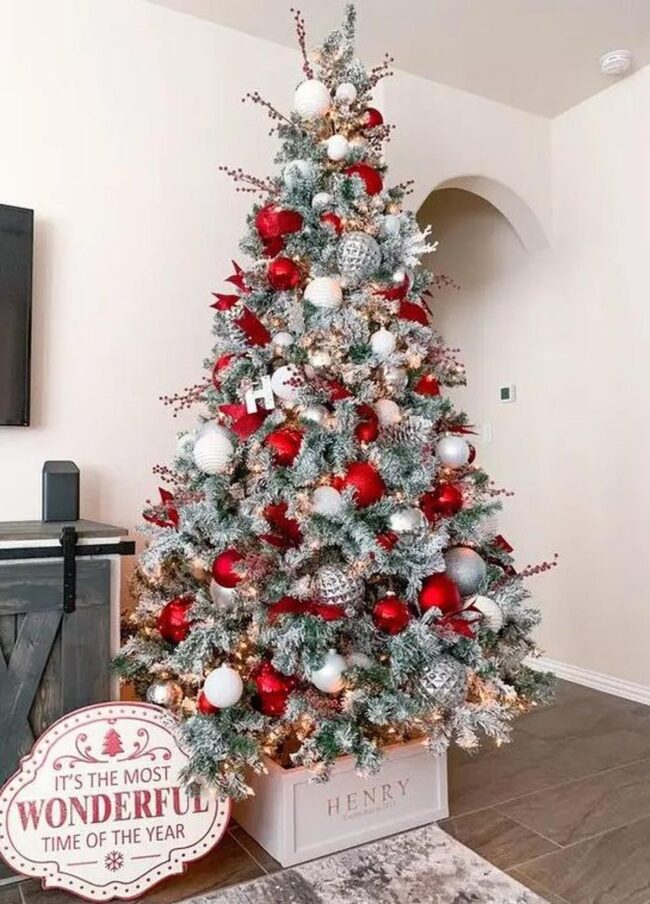 Christmas trees become stunning centerpieces when decorated with classic red and white ornaments that cascade beautifully across lush green branches.
