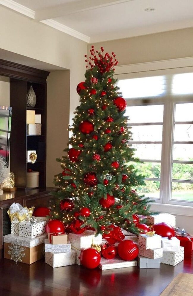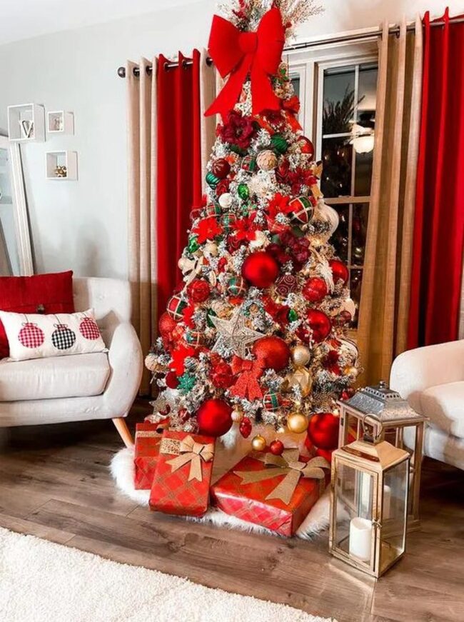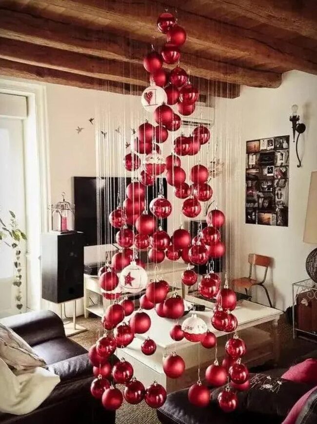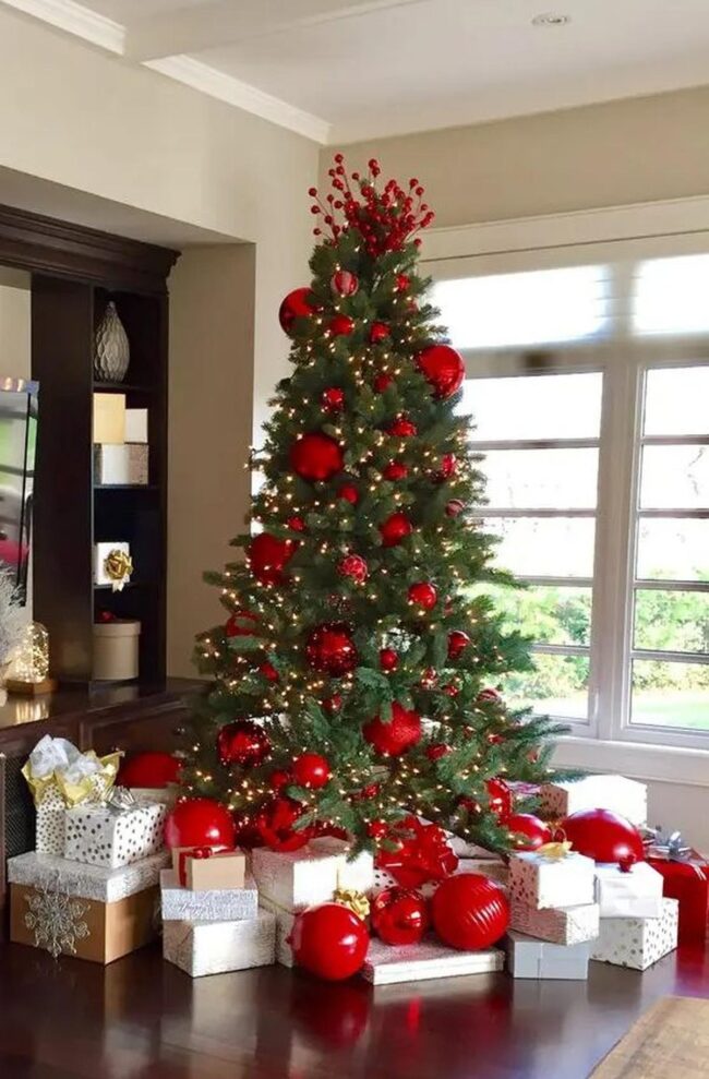 Brilliant red and white ornaments dance against lush green branches, catching eyes from across the room.