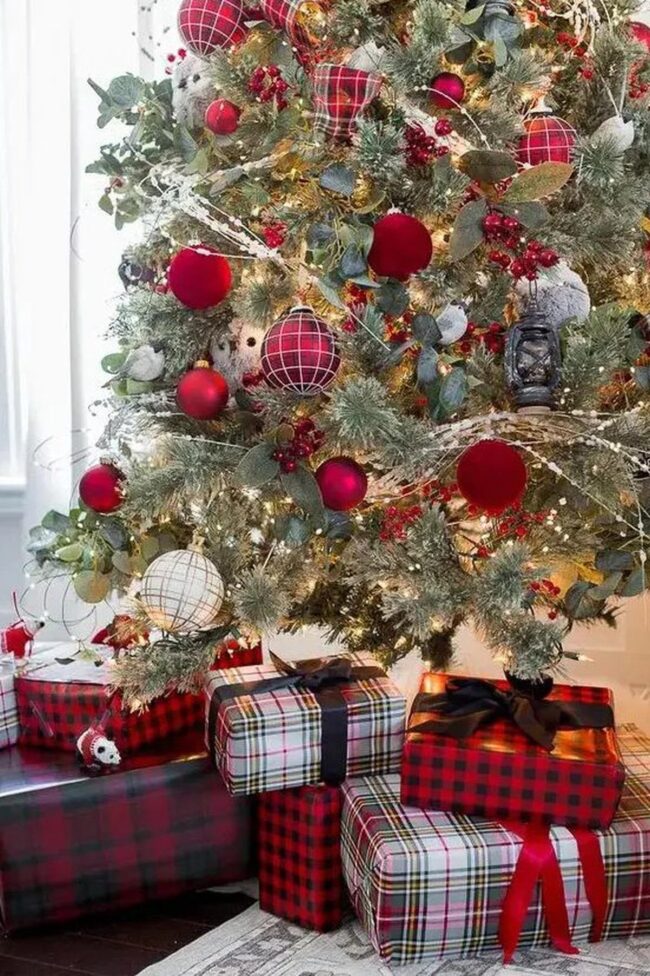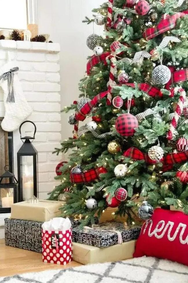 Decking out your Christmas tree with dramatic red and black plaid ribbons brings stunning visual drama to lush green branches.