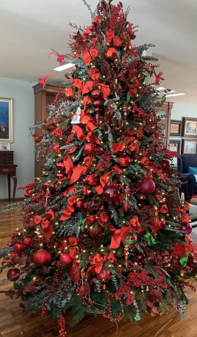 Majestic red ribbons crown the treetop, adding a dramatic signature to your seasonal centerpiece.