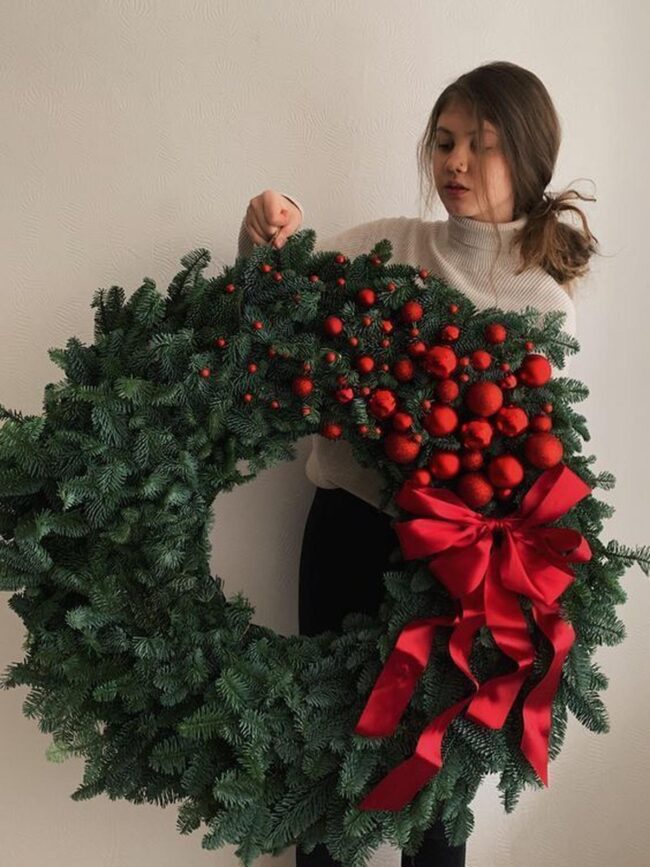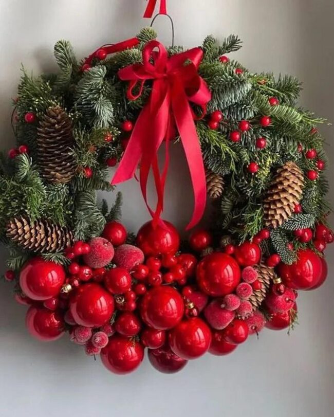 Soft shadows and reflective decorations make the wreath come alive, drawing eyes and hearts toward its enchanting details.