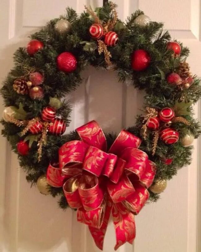 Classic red ribbons with shimmering patterns wrap around the circular design, creating a welcoming focal point for winter celebrations.