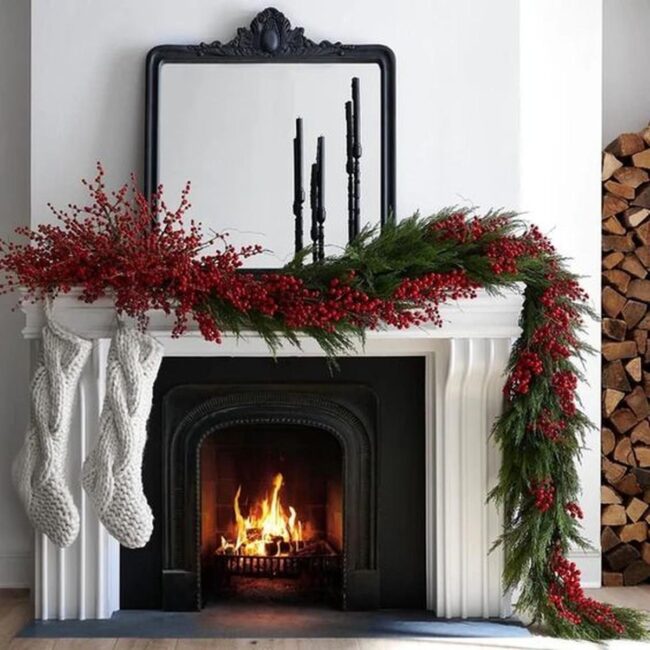 Soft white knitted stockings swing gently from the mantel's edge, complementing the lush green pine garland adorned with vibrant red berries.