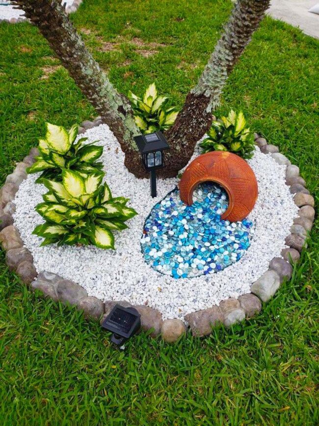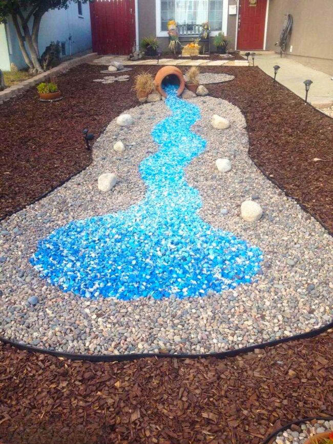 Stone edging frames a mesmerizing landscape where white gravel intermingles with shimmering blue glass pebbles, creating an ocean-inspired ground cover.