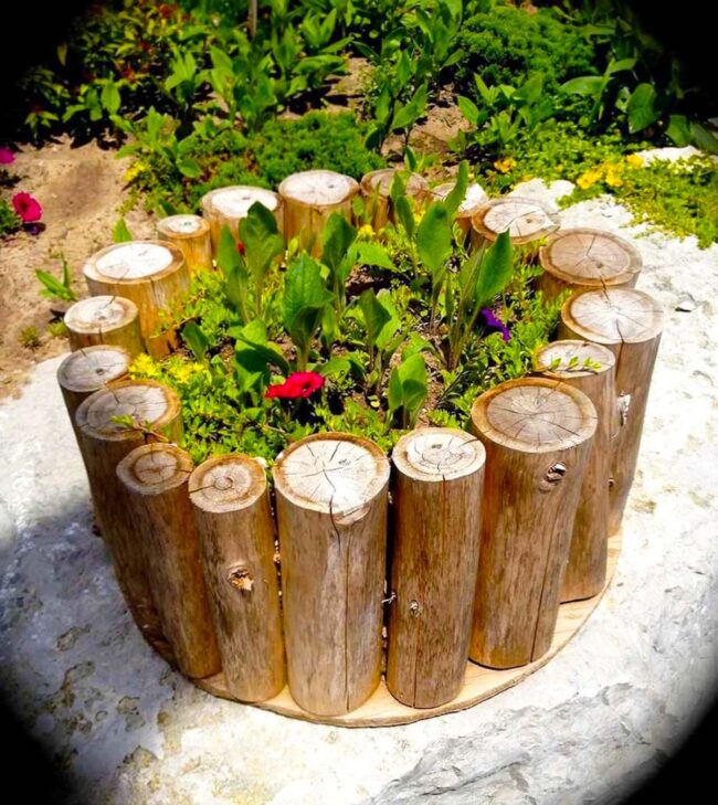 Log circle planters bring rustic charm to garden spaces, creating a natural haven for beautiful greenery.