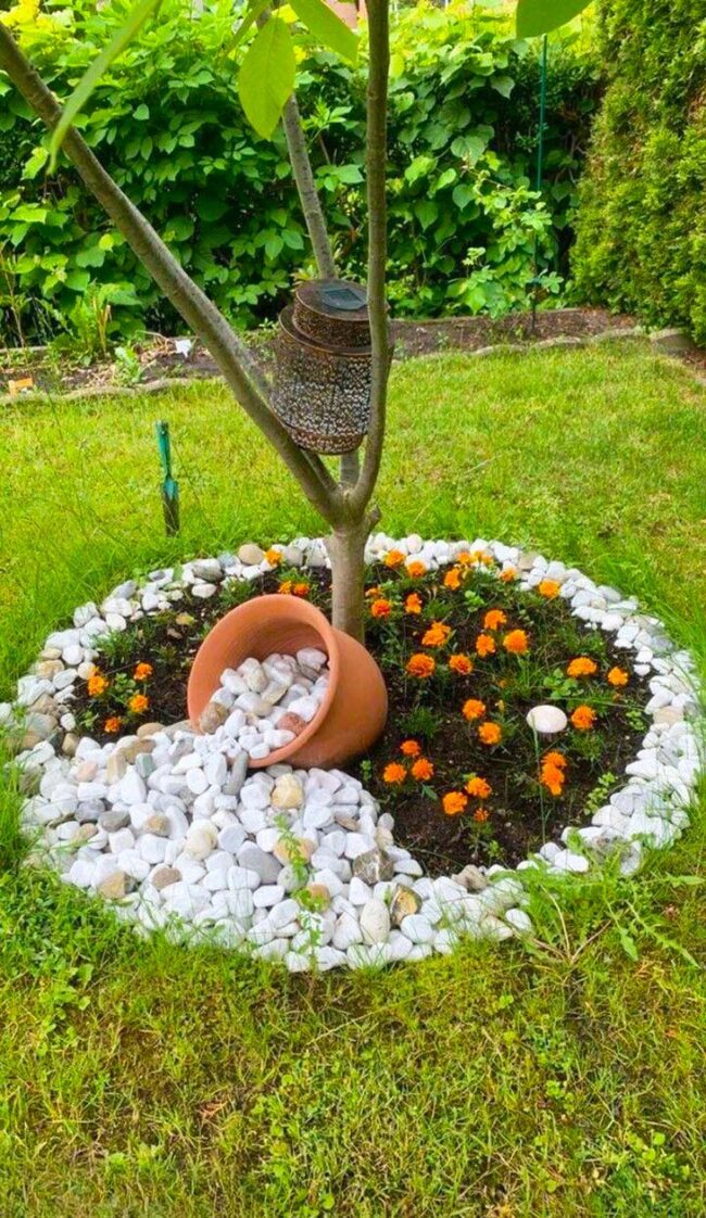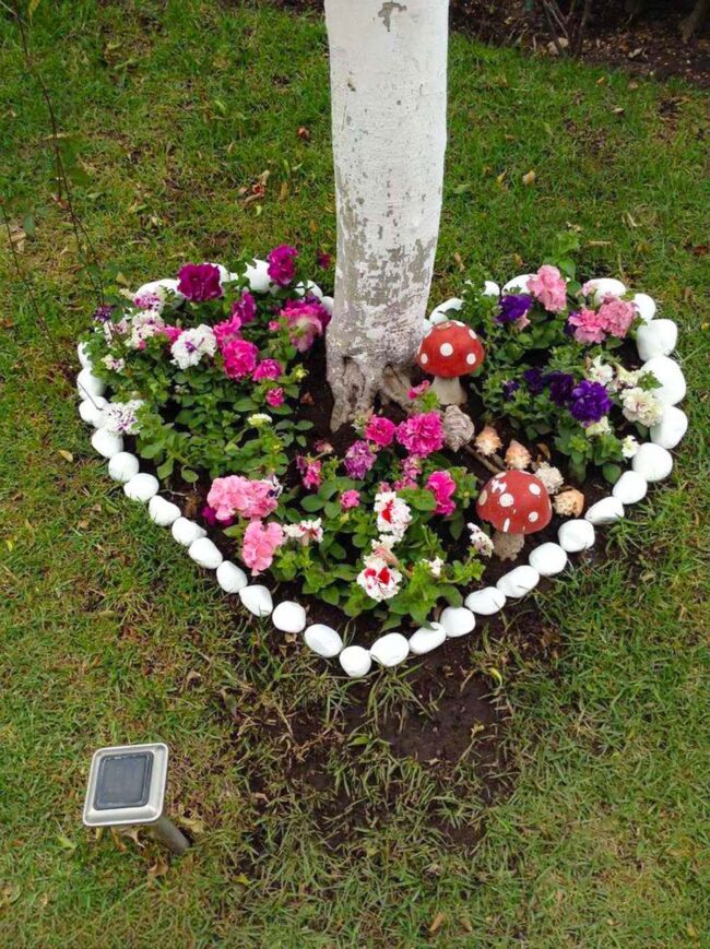 Garden lovers adore heart-shaped floral masterpieces that capture nature's romantic essence, especially when delicate petunias and cheerful geraniums dance around tree bases.