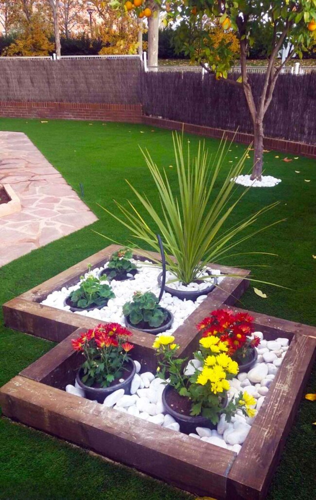 Pristine white stones nestle between the planters, providing a clean visual contrast against the rich green synthetic turf.