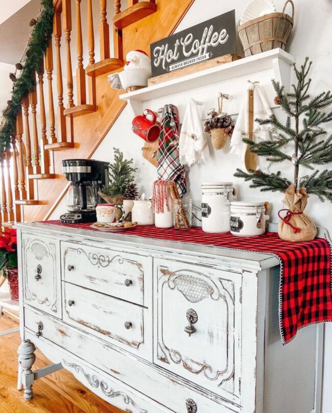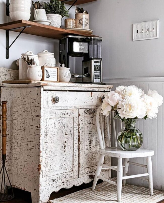 Vintage charm springs to life when an antique sideboard becomes a delightful coffee bar with distressed chalk paint.