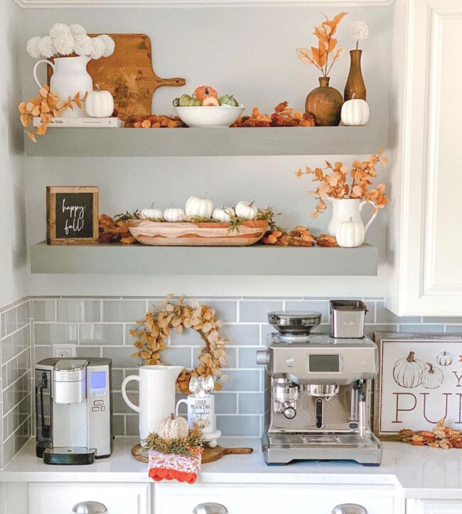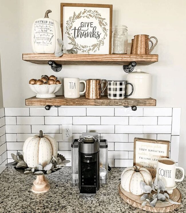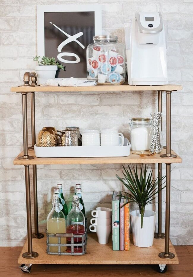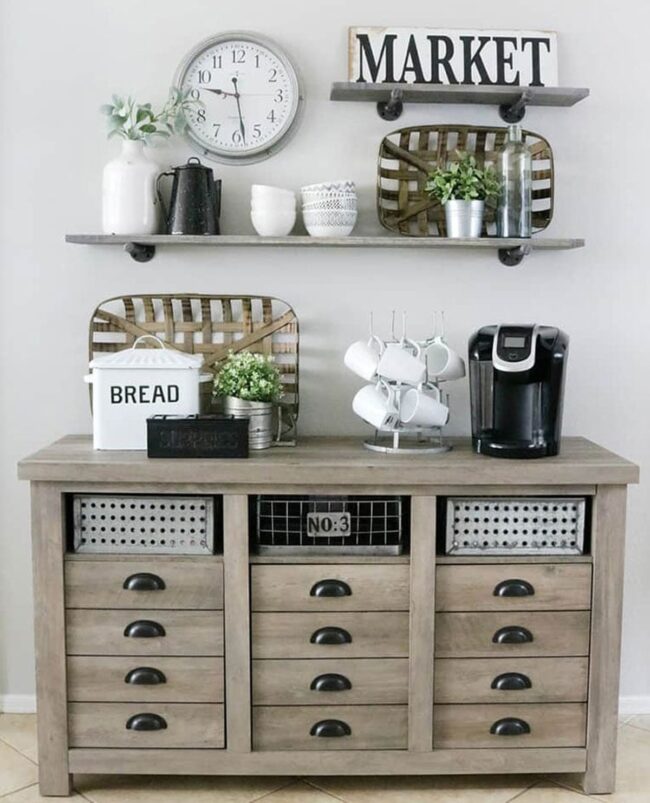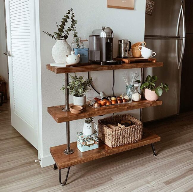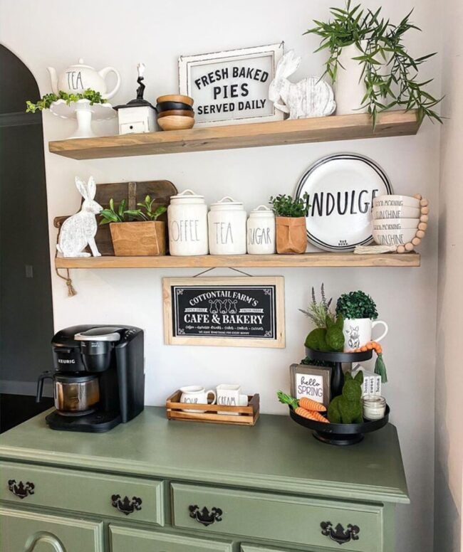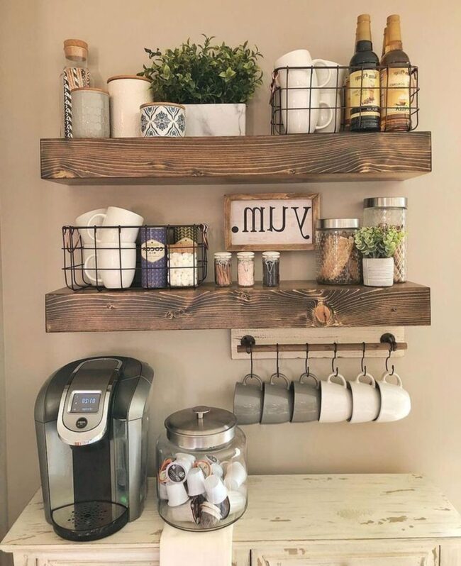 Stylish shelving units easily become charming beverage stations that showcase your favorite pod coffee maker.