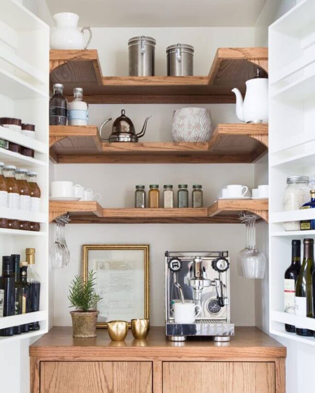 Wooden shelves provide perfect storage for coffee beans, elegant cups, and delightful accessories.