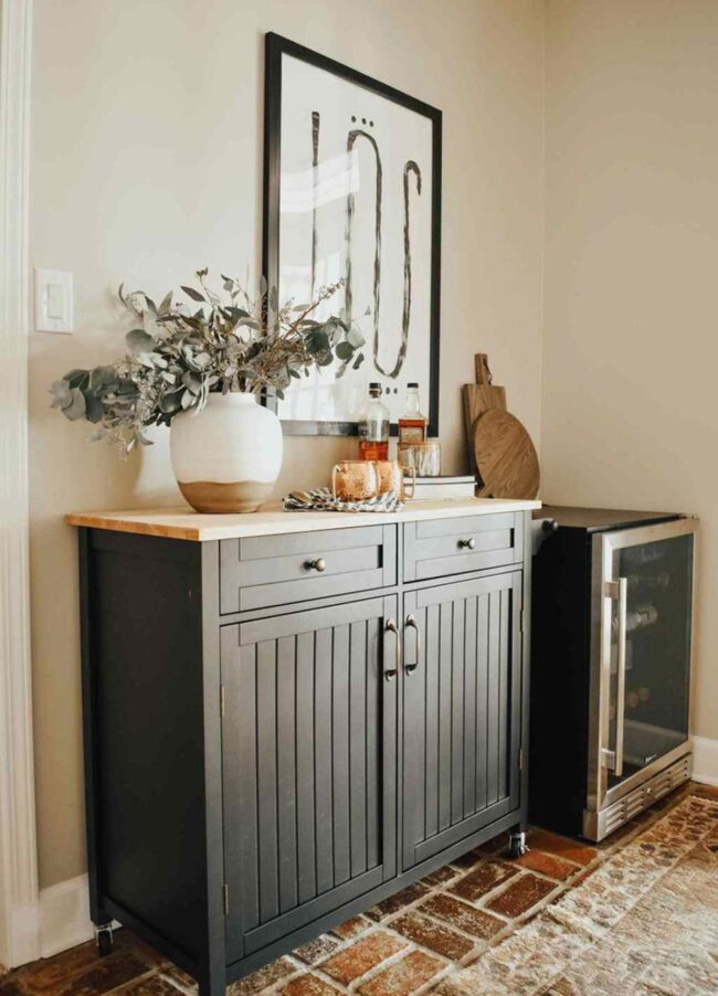 Small details like unique hardware elevate the entire look from simple furniture to a custom coffee station.