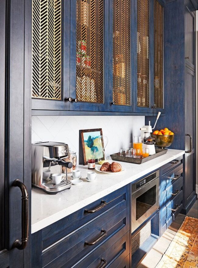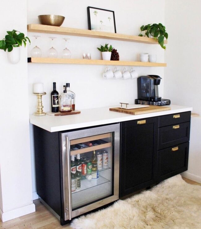 Black cabinets and matte gold drawer pulls create a luxurious coffee station that instantly elevates kitchen design.