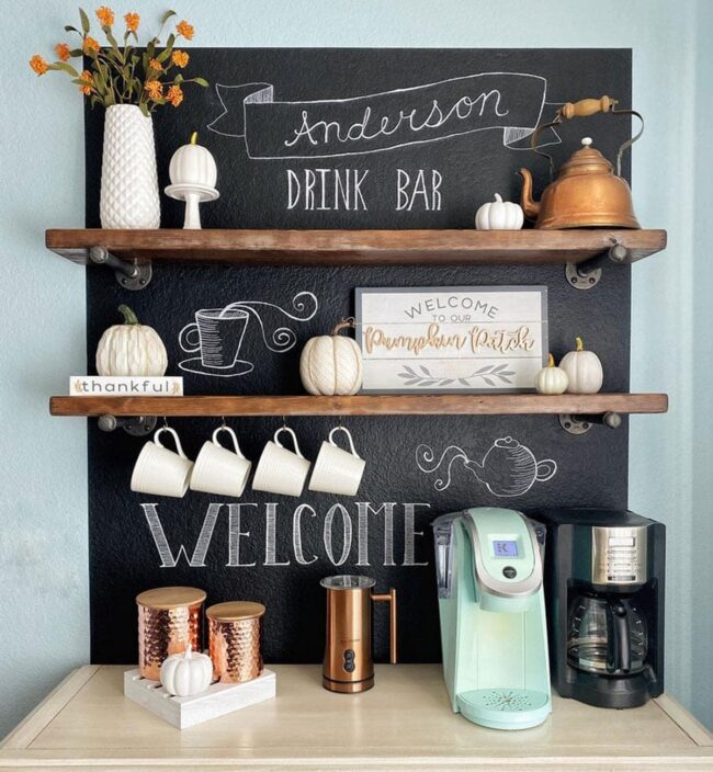 Peel and stick chalkboard wallpaper creates a playful backdrop for morning notes and coffee inspirations.