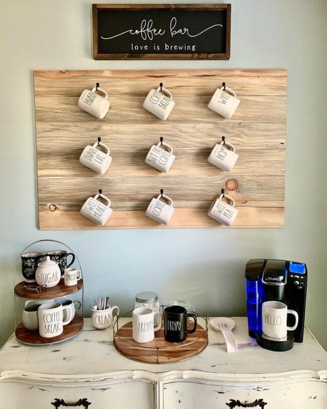 Personal accents elevate the area, from a playful mug tree to an eye-catching sign that reflects individual style.