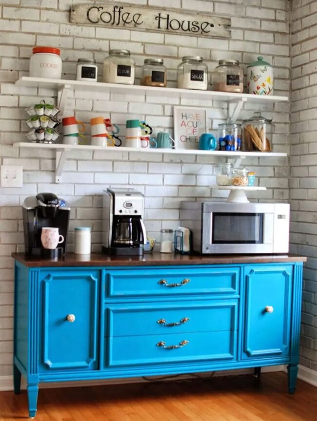 Charming coffee nooks burst with personality through vintage sideboards and colorful accents that instantly energize your space.