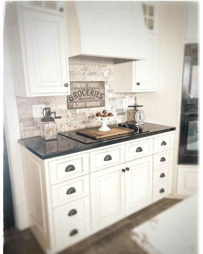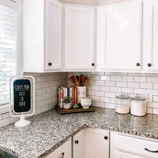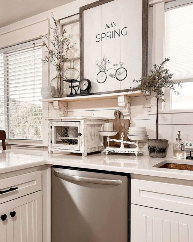 White cabinets and off-white walls provide a perfect neutral backdrop for these decorative pieces.