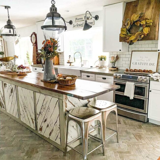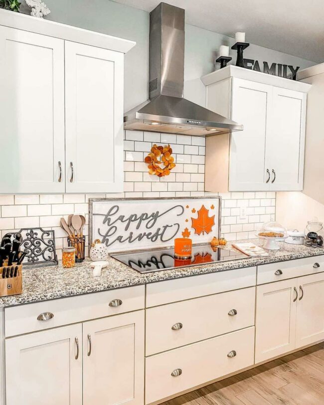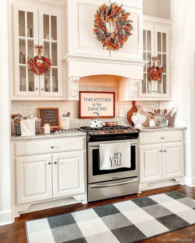 Fall wreaths grace the white subway tile backsplash, adding layers of seasonal charm.