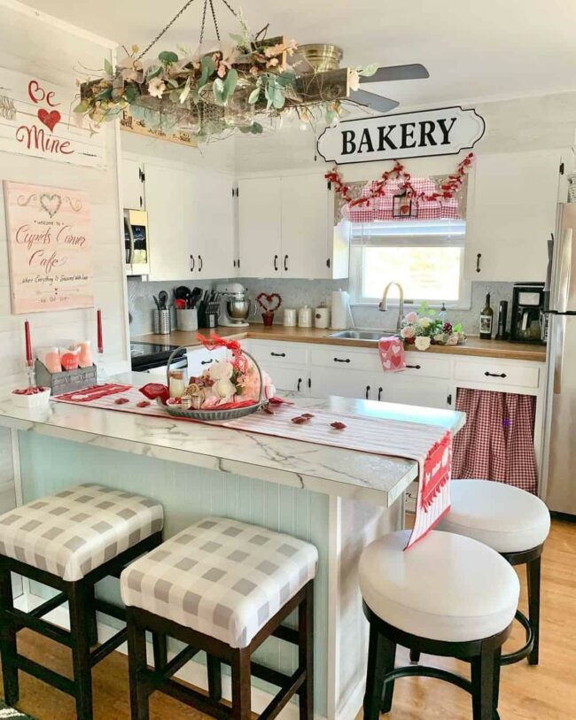 Hanging above the island, a whimsical Easter sign adds personality and spark to the space.