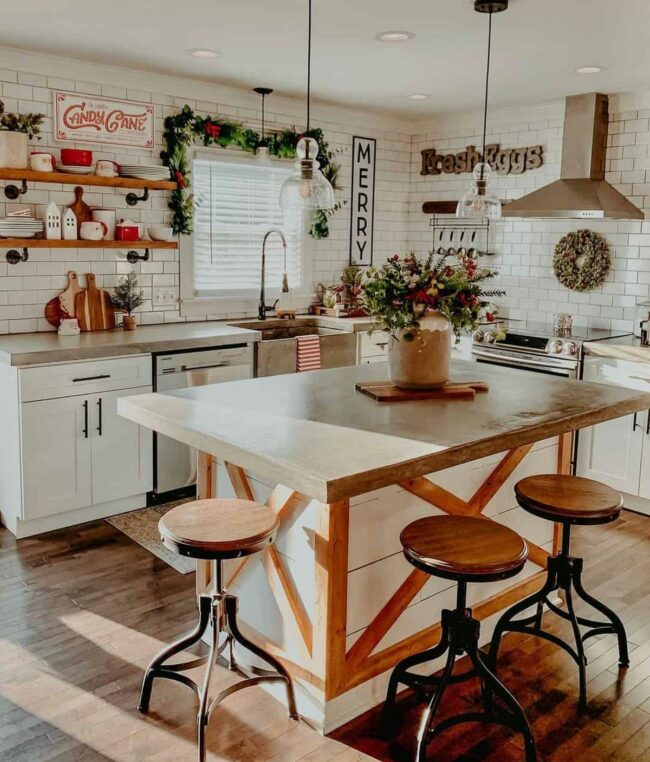 Decorative elements blend seamlessly, transforming the kitchen into a delightful holiday haven that feels both elegant and comfortable.