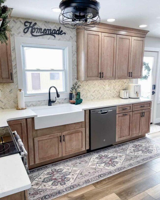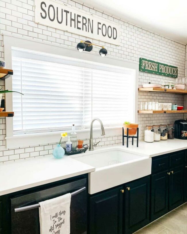 White subway tiles frame a charming farmhouse kitchen sign above the window, creating a welcoming atmosphere.
