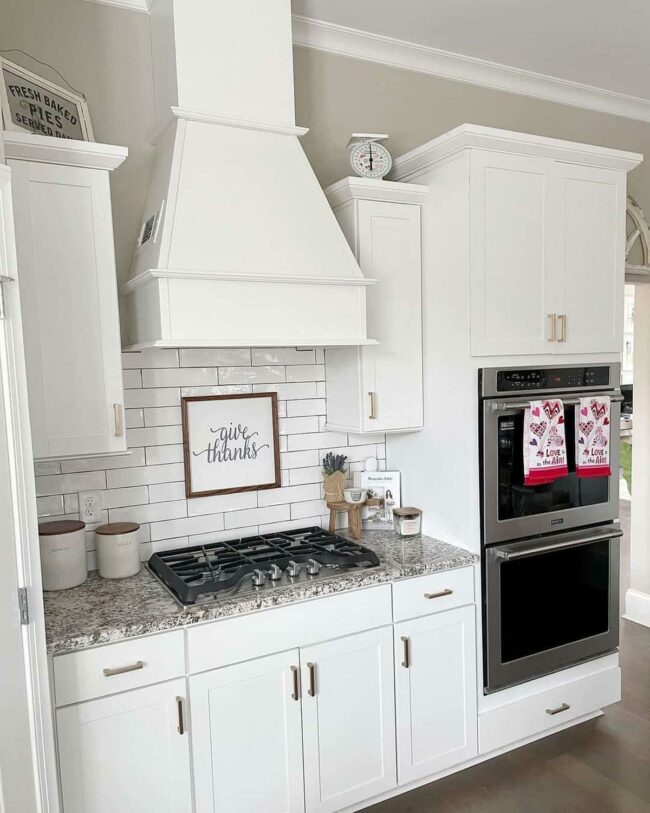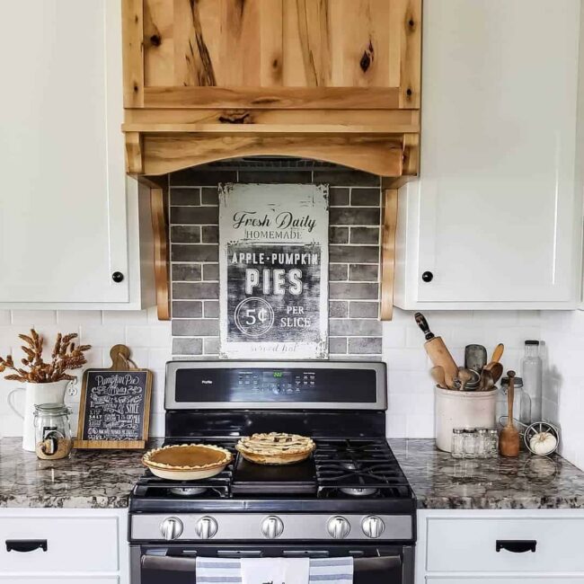 Kitchen designs flourish with rustic farmhouse charm when white cabinets frame a classic white hood against gray brick backsplash.