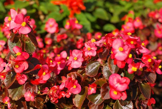Begonias bring stunning elegance to shaded garden spaces with their captivating bronze-tinged leaves and eye-catching red or pink blossoms.