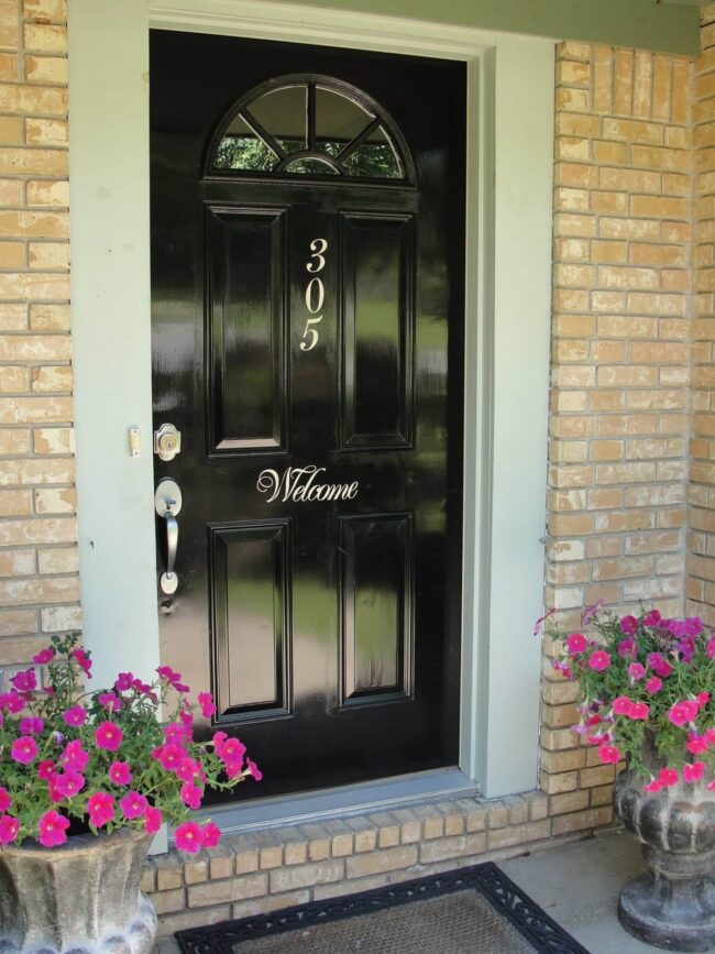 Striking black paint creates a stunning contrast against the soft brick exterior.