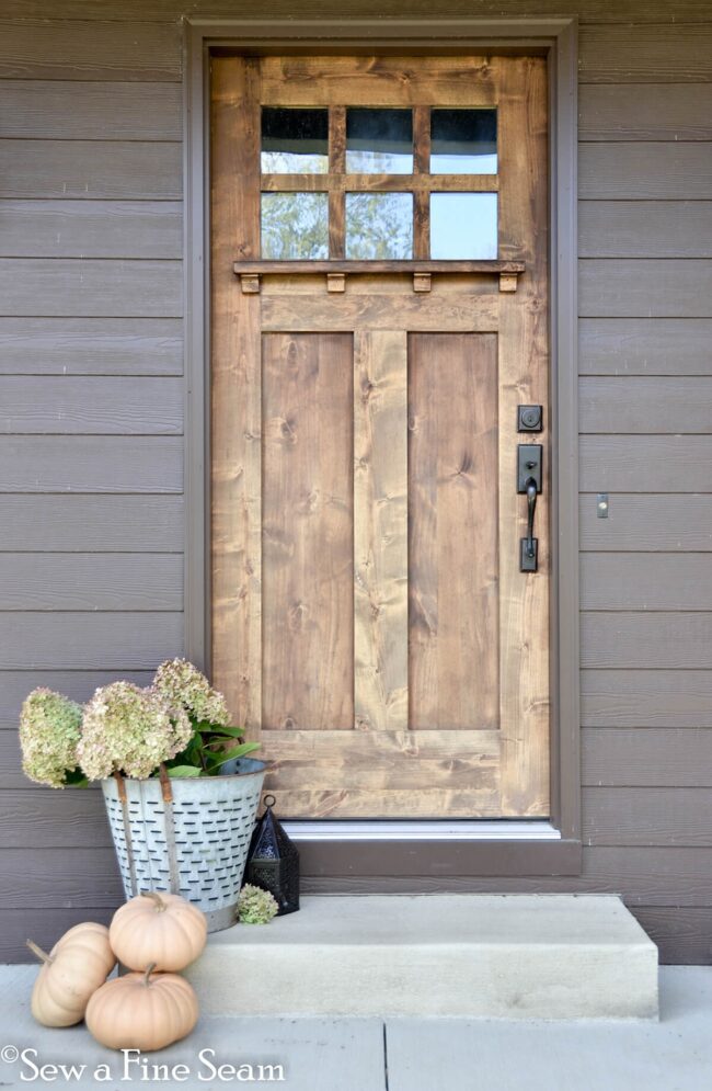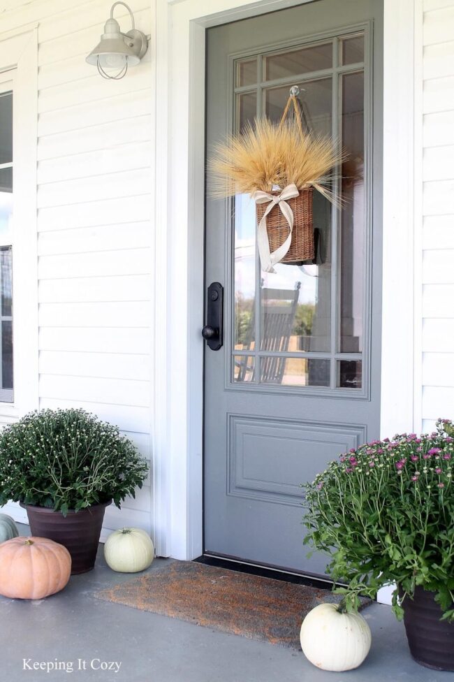 Dove gray doors elegantly welcome autumn's arrival, complementing white house siding and creating a refined aesthetic for classic homes.