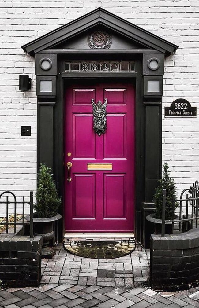 Magenta front doors make bold statements against charcoal gray landscapes, capturing immediate attention with their daring color choice.