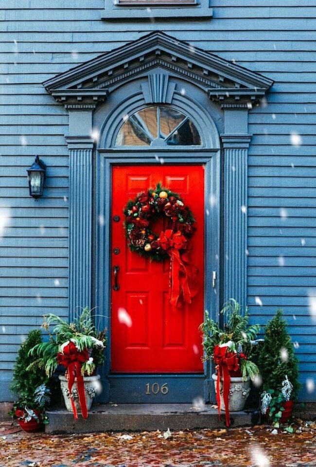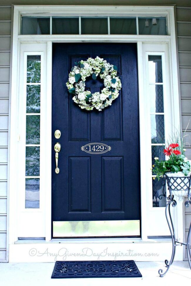 Seasonal decorations like blue-accented wreaths can beautifully complement the door's elegant hue.