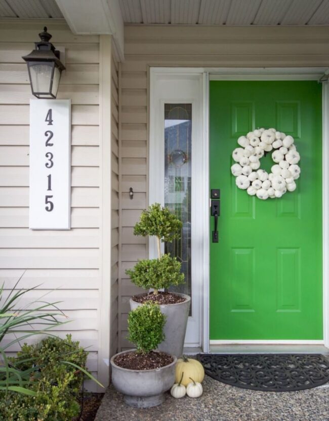 Pairing such a statement color with a rustic fall wreath instantly elevates the entrance's sophistication.