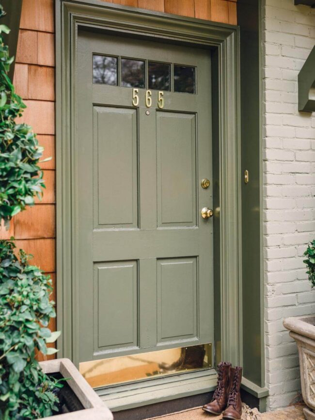 Muted olive green adorns the door, perfectly complementing the pale gray exterior paint.