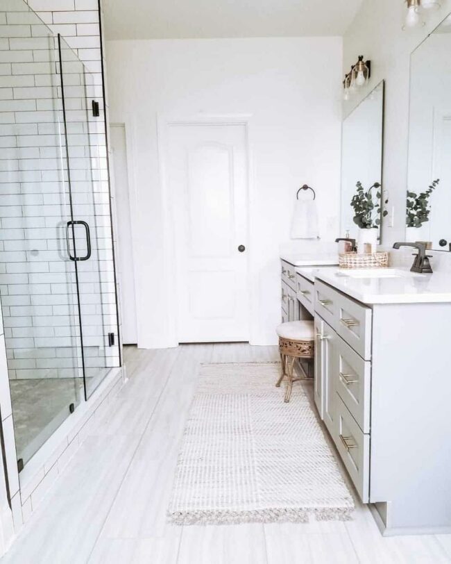 Modern bathroom design reaches new heights with a chic double sink area in light gray, setting a sophisticated tone for the space.