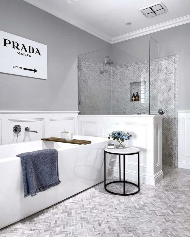 Gray bathrooms radiate modern elegance with herringbone patterns that steal the show.