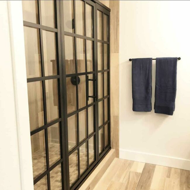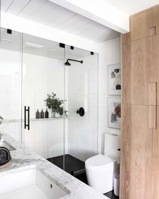 Cool geometric lines of the glass doors contrast beautifully with organic wood tones, making the bathroom feel both contemporary and welcoming.