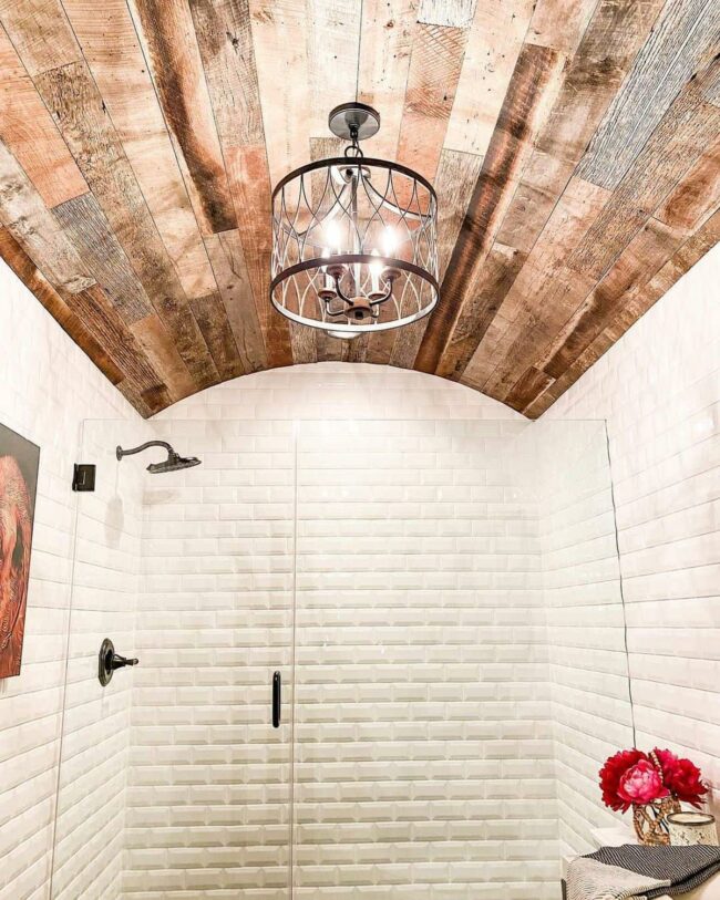 Rustic charm meets modern elegance in this bathroom sanctuary, where a graceful chandelier casts a warm glow over luxurious design elements.