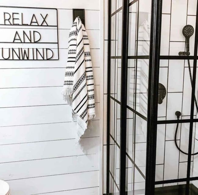 Glass-and-white shiplap divides the tub area with refined sophistication.