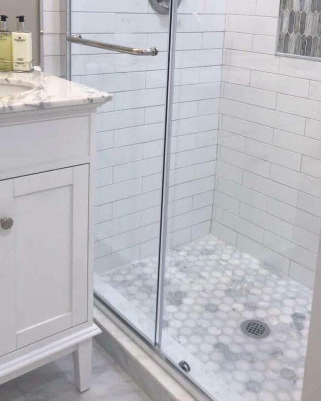 Cutting-edge design dominates this walk-in shower with stunning grey hexagonal floor tiles that immediately draw the eye.
