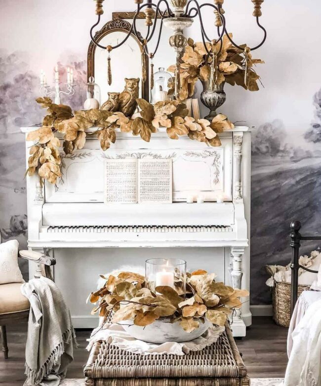 Delicate fall leaf garlands draped across furniture bring organic movement and subtle color.