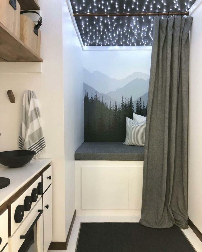 Gray murals wrap around a comfy built-in bench, creating an enchanting personal space for quiet moments.