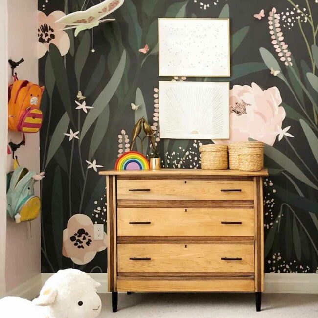 Kids discover pure magic in this playful bedroom where a green wall mural bursting with pink flowers creates an instant wow factor.