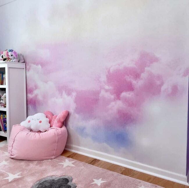 Pink and blue clouds dance across the wall, casting magic into her personal sanctuary.