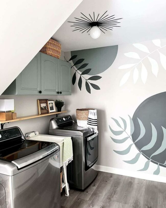Large leaf-patterned wall art adds dramatic flair, making the area feel more like a creative space than a utility room.