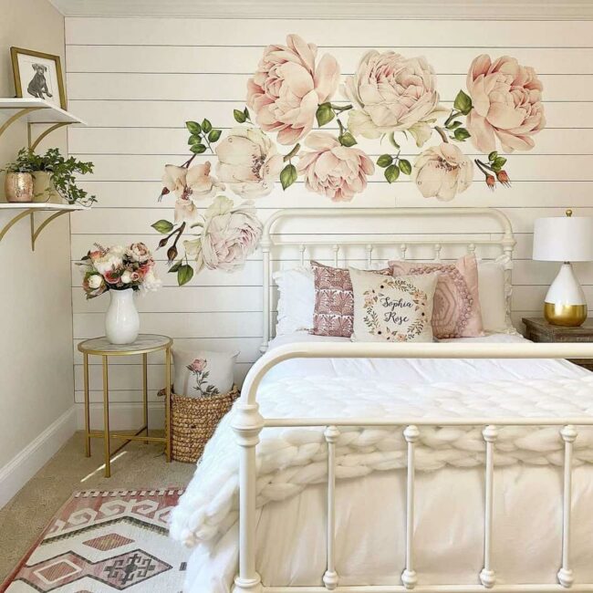 White shiplap walls radiate freshness with large pink floral decals that spark immediate visual interest.