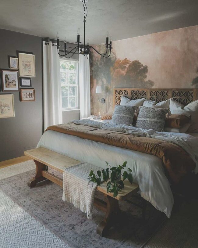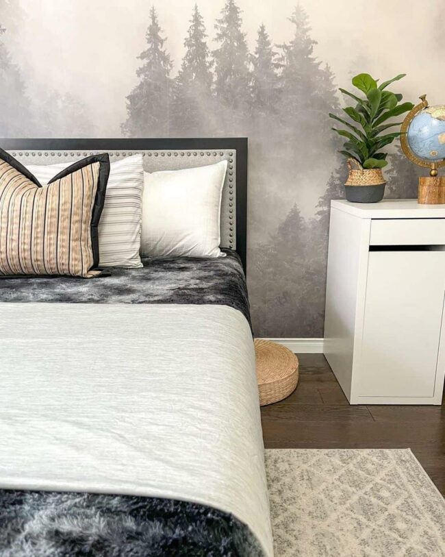 Forest-inspired gray wallpaper sets a calm mood in this bedroom sanctuary, perfectly complemented by a dramatic black metal spindle bed.