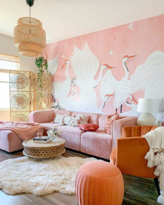 Pink walls and a captivating crane mural breathe life into this extraordinary living room, where a luxurious velvet sofa commands attention against the artistic backdrop.