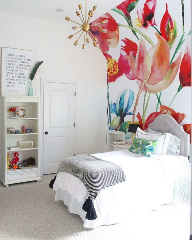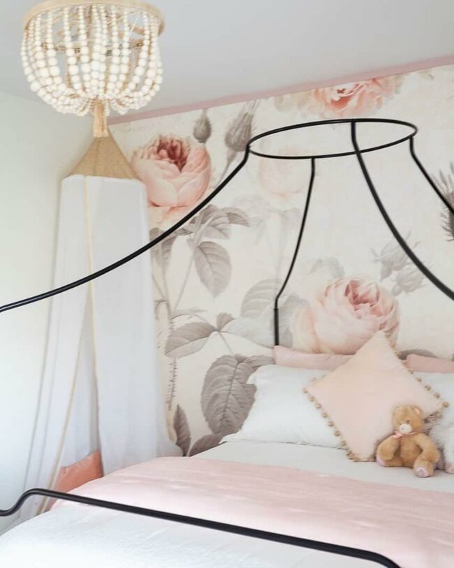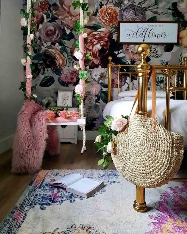 Colorful roses and peonies wallpaper bursts with personality in this boho-inspired girl's bedroom.