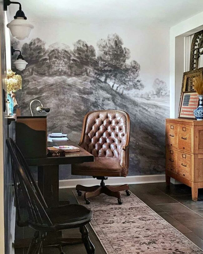 Gray landscape murals inspire creativity in this office sanctuary, where a dark wood desk meets an antique brown leather chair for maximum comfort.