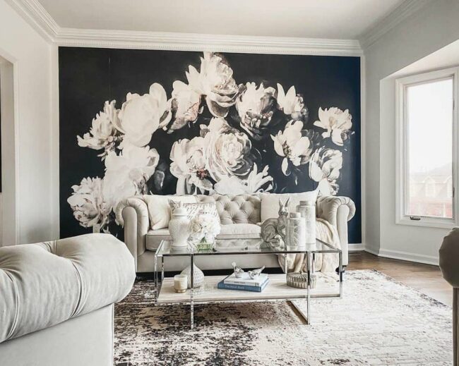 Black and white floral murals dramatically elevate living spaces with unexpected elegance.