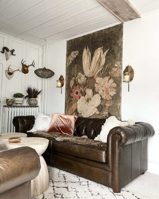 Brown floral tapestry whispers historical charm across the room's landscape, instantly drawing attention with its rich textile narrative.